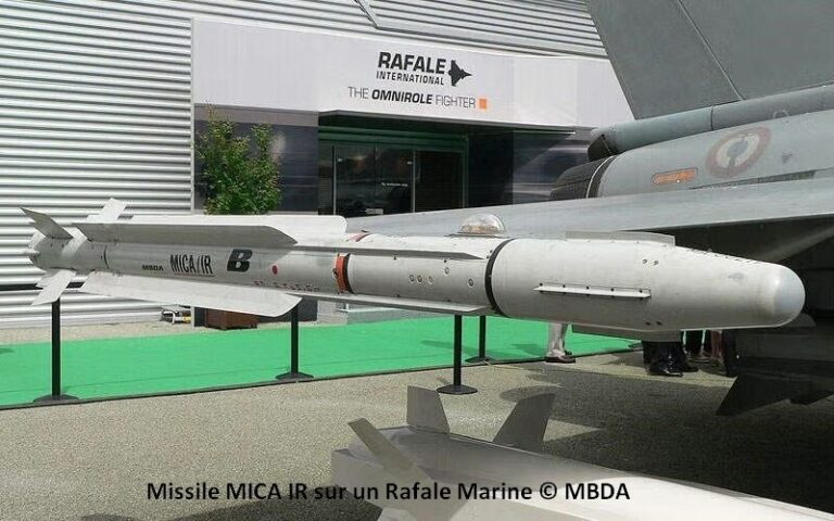 Le missile français antiaérien MICA (Missile d’Interception, de Combat et d’Auto-défense) d’une portée de 60 km pour la version IR (air-air à guidage infrarouge) et 80 km pour la version EM (air-air à guidage électromagnétique). Il est de type « tire et oublie », volant à Mach4, il emporte une charge de 12 kg d’explosif.